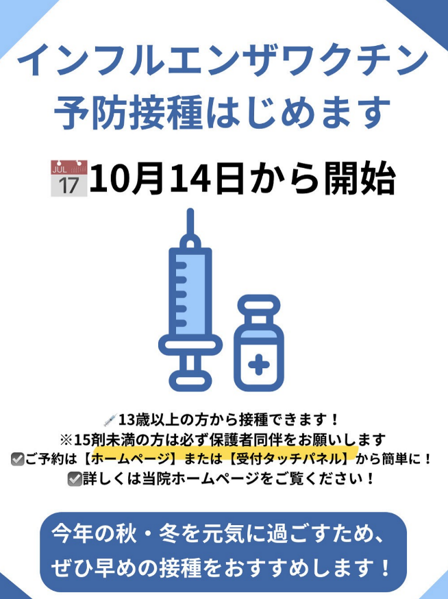 インフルエンザ予防接種のご予約を承っております。枠に限りがありますので、お早めに予約ください。