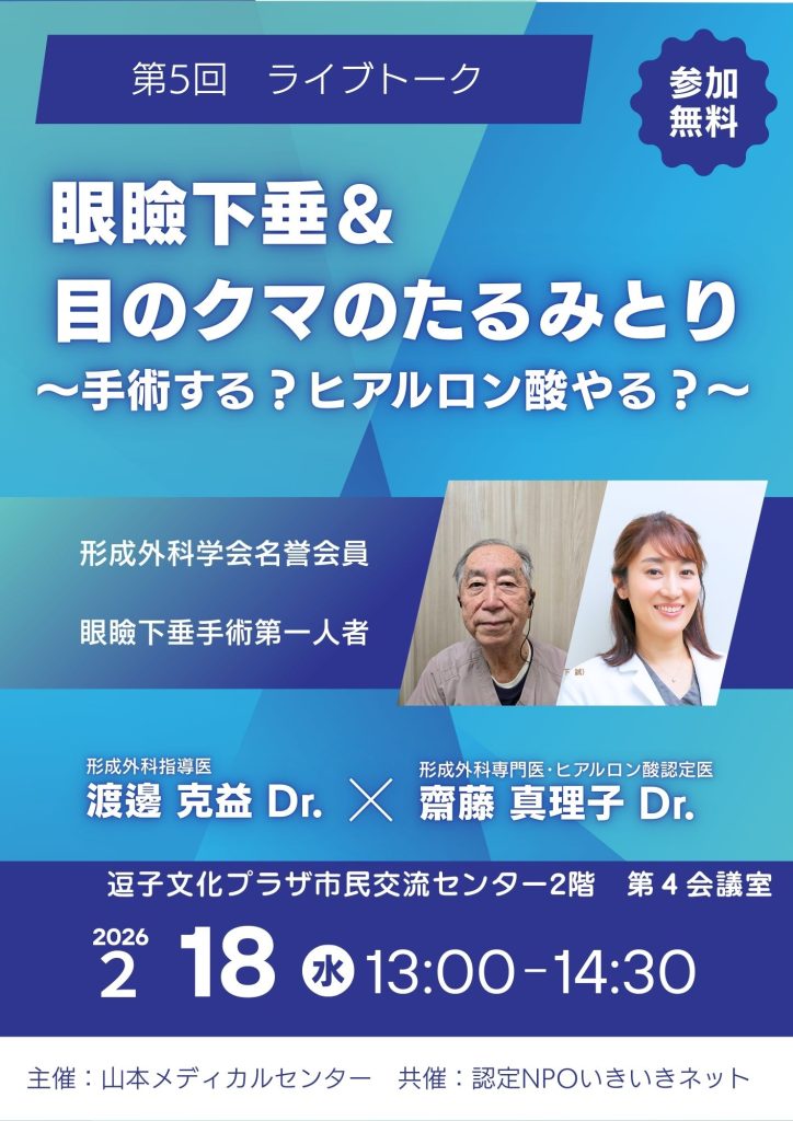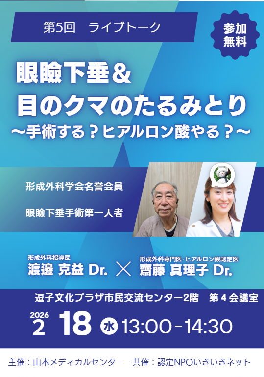 2月18日(水)ライブトークは、まぶたが下がって目が開きにくくなる「眼瞼下垂」などの手術で数多くの実績を持つ当院渡辺克益医師と真理子医師による講演です。貴重な機会なので、ぜひご参加ください。